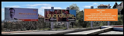 Um esclarecimento: A fotografia que publico, feita na Rotunda da Ti´Jaquina, tem dois cartazes reais, o de Rangel e o da Guarda-me. o terceiro, cor de laranja, é uma invenção minha, com frases retiradas do sítio oficial do PSD para apresentarem Álvaro Amaro A Oliveira